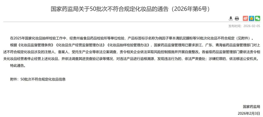 2月5日,国家药监局官网发布《50批次化妆品不符合规定的通告》(2026年第6号)。通告显示,在2025年国家化妆品抽样检验工作中,经贵州省食品药品检验所等单位检验,产品标签标示名称为俏因子草本清肌泥膜粉等50批次化妆品不符合规定。
