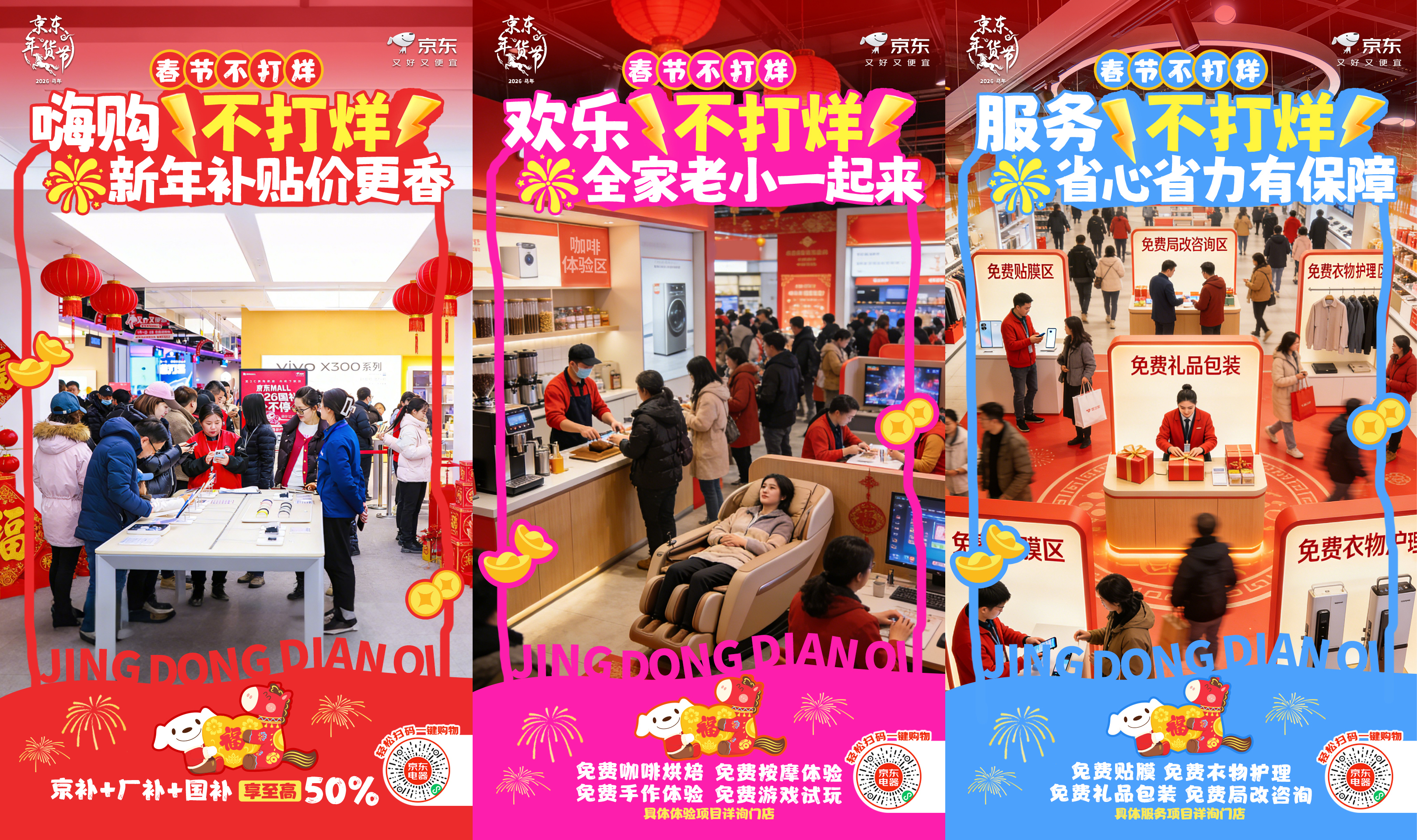 新春佳节,年味渐浓。除了和家人团聚、走亲访友,不少人还盘算着添置新物件、备齐年礼,给新年添点新气象。今年春节,不用愁没地方逛,全国 240 余家京东自营门店(含京东 MALL、京东电器城市旗舰店等)春节暖心不打烊,手机、平板、电脑、数码及智能家电可享国补与以旧换新双重优惠,把科技好物、传统年味和趣味活动一站式配齐,成为这个春节“逛gai”的绝佳新选择。