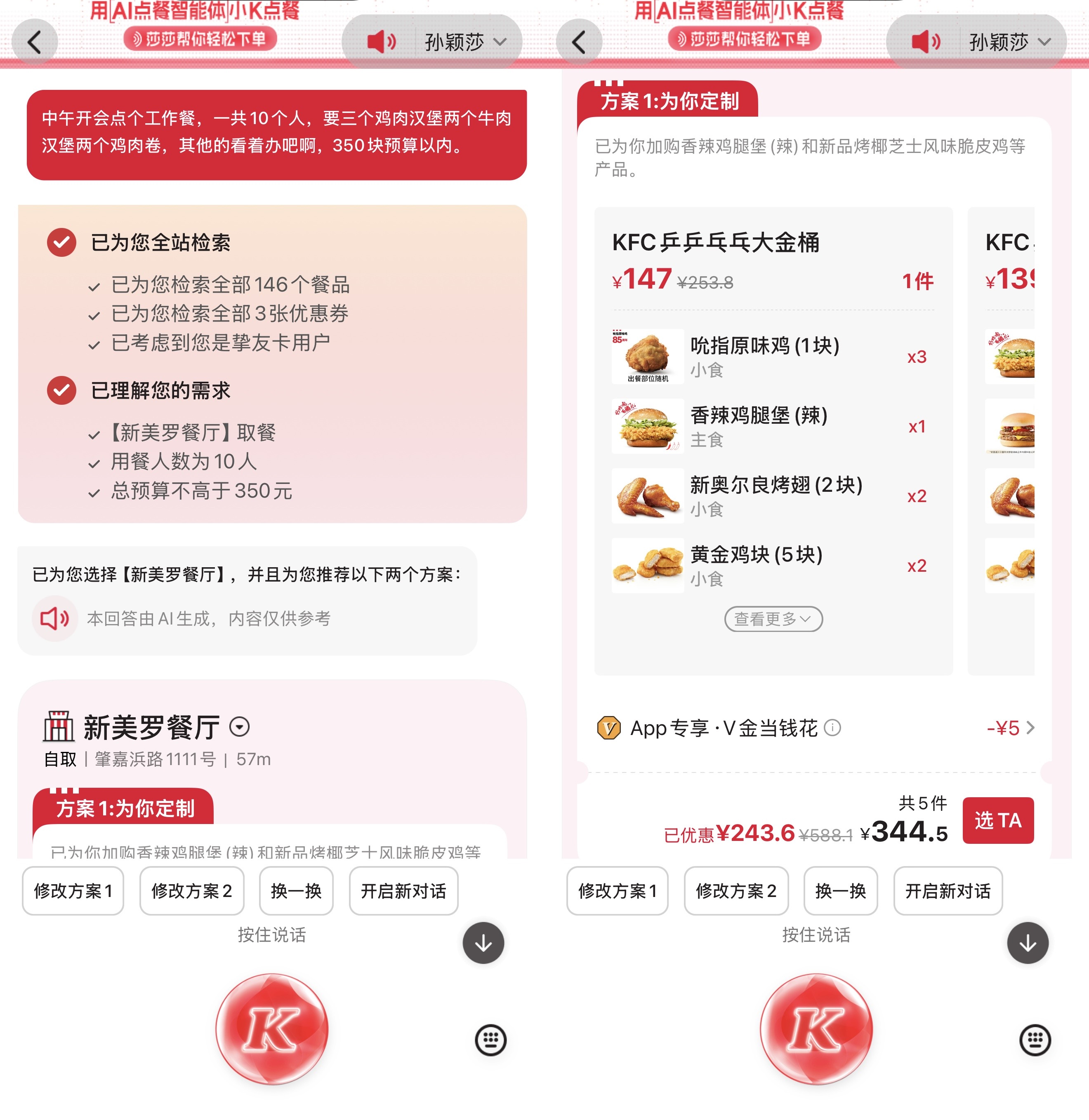 比如,当用户提出“中午开会点个工作餐,一共10个人,要三个鸡肉汉堡、两个牛肉汉堡、两个鸡肉卷,其他看着办,350块以内”,小K可生成对应口味、预算的套餐。