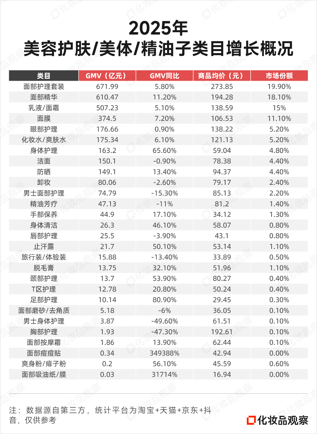 先看护肤大盘,2025年美容护肤/美体/精油总GMV达3363.73亿,同比增长7%。2026年开年势头更猛,1月卖了264.2亿,同比增长15.6%。