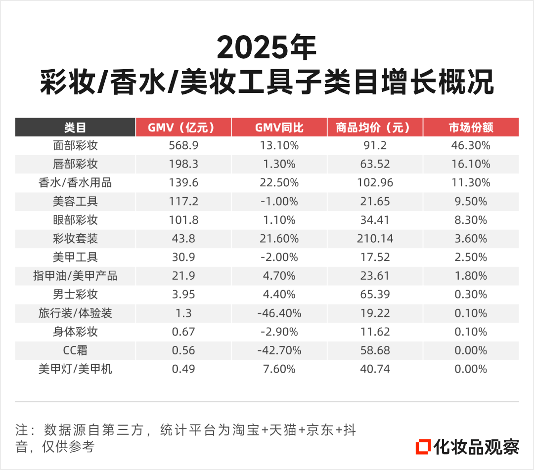 先看整体。2025年,彩妆/香水/美妆工具GMV达1227.94亿,同比增长9%;2026年1月,GMV增长25.6%至127.7亿,持续释放回暖信号。
