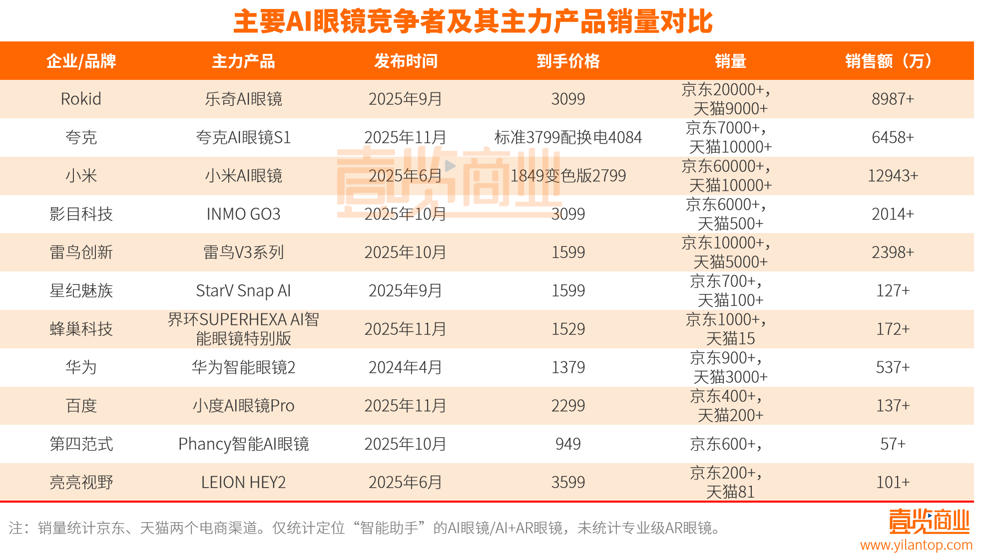 从销量看,在主流电商渠道中,小米AI眼镜成为目前销量表现最突出的产品:同周期统计口径下,小米AI眼镜在京东、天猫合计销量超过7万台,对应销售额接近1.3亿元;Rokid紧随其后,其主力产品乐奇AI眼镜在3000元以上价位段仍能做到近3万台的合计销量;再往下,是阿里体系内的夸克AI眼镜S1,同样在高客单价区间站稳脚跟。