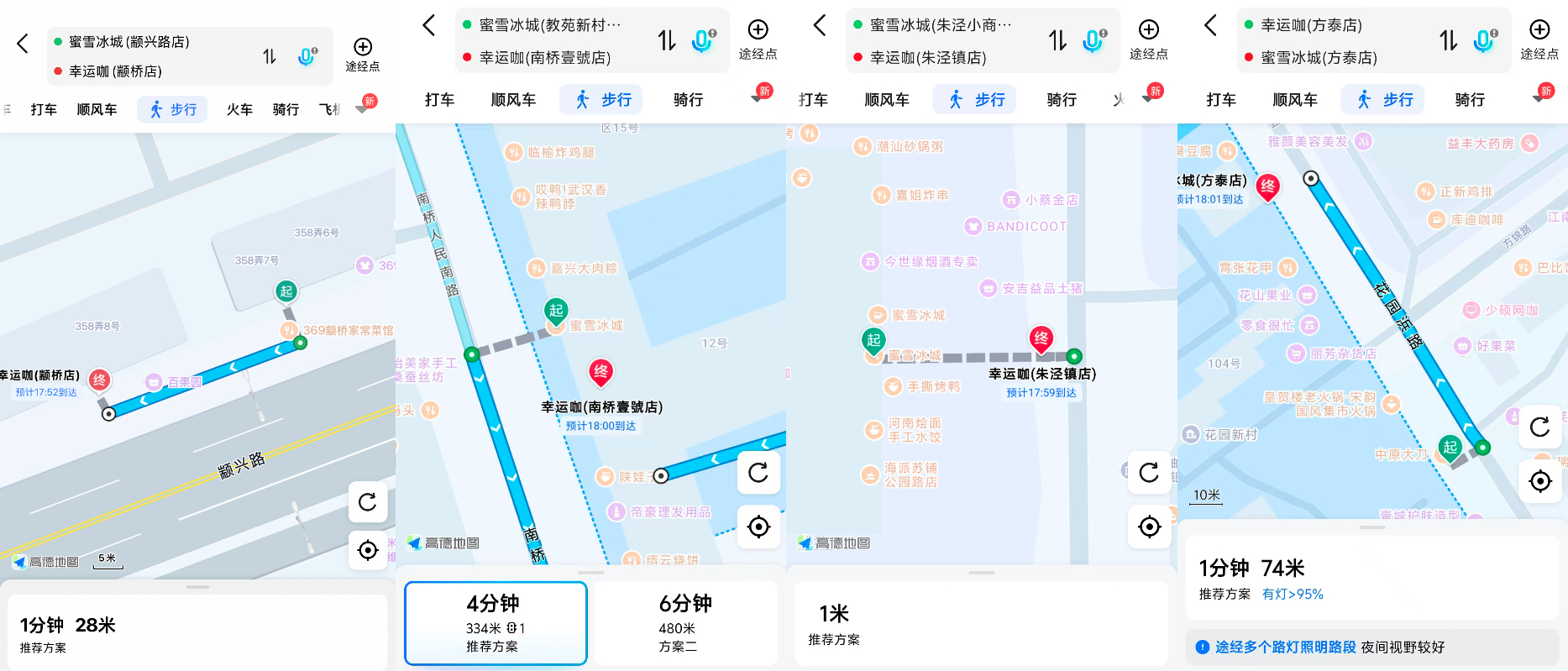 首先,在选址上,幸运咖往往靠近蜜雪冰城,形成事实上的客流叠加和隐性竞争。以上海为例,幸运咖的17家门店中,有8家500米范围内存在蜜雪冰城,最近门店的直线距离不超过30米,占比达47.06%。