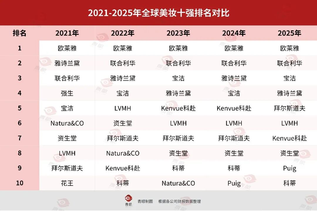 对比2021年和2025年,首先从名单上来看,Natura&CO和花王均已不在榜上,取而代之的是科蒂和Puig。而从名次上来看,欧莱雅稳居第一名;第二名的位置在2021年属于雅诗兰黛,但自2022年开始,则是由联合利华牢牢占据。同时,雅诗兰黛和宝洁也开始连续4年,在第三、第四名中“你追我赶”。