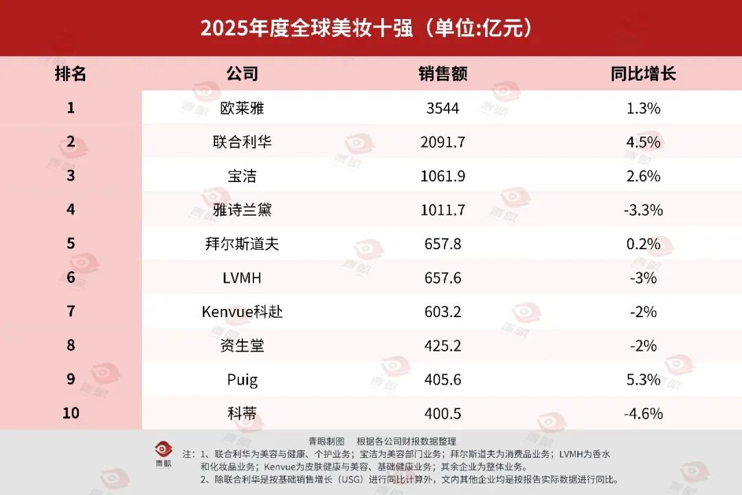 1、全球美妆十强销售额数据因汇率波动换算存在一定误差。除特殊说明外,文内统一为人民币单位。