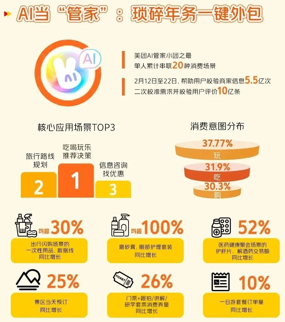 千问与淘宝闪购在春节加速融合,美团则在春节前期发布AI管家问小团,据其发布的数据,春节期间有过亿人次用户通过“小团”规划吃喝玩乐消费,“小团”累计核验了7亿次全国商家信息。