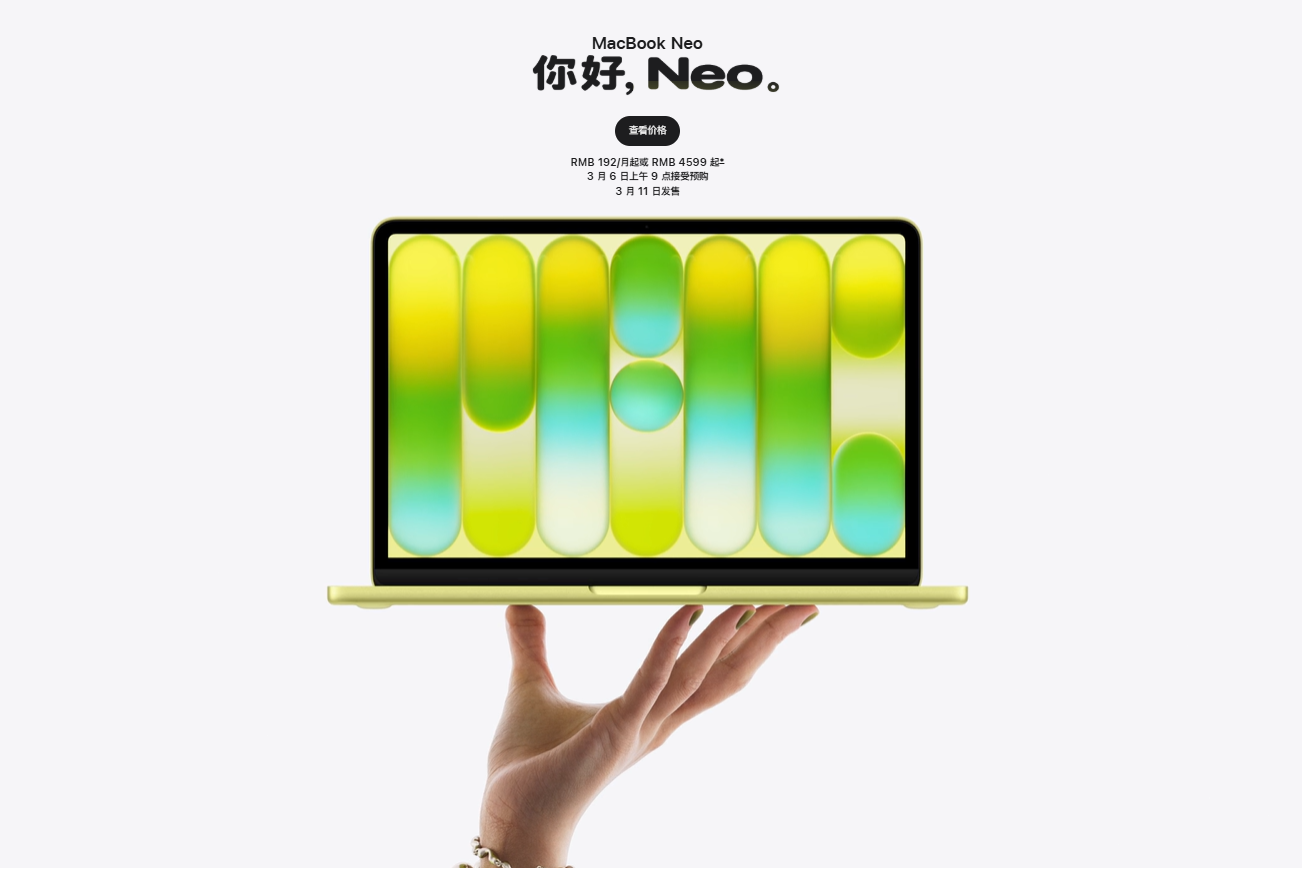 3月4日22点,Apple正式推出备受期待的“平价版MacBook”——MacBook Neo,起售价4599元,成为苹果价格最低的笔记本产品,一经发布便迅速登上热搜。新品将于3月6日晚在京东MALL、京东电器城市旗舰店开启预约,叠加国家补贴后到手价仅3909.15元起,3月11日正式发售,消费者不仅能在京东MALL、京东电器城市旗舰店第一时间体验真机,更能享受国家补贴、教育优惠与以旧换新三重福利,大幅降低换新门槛。