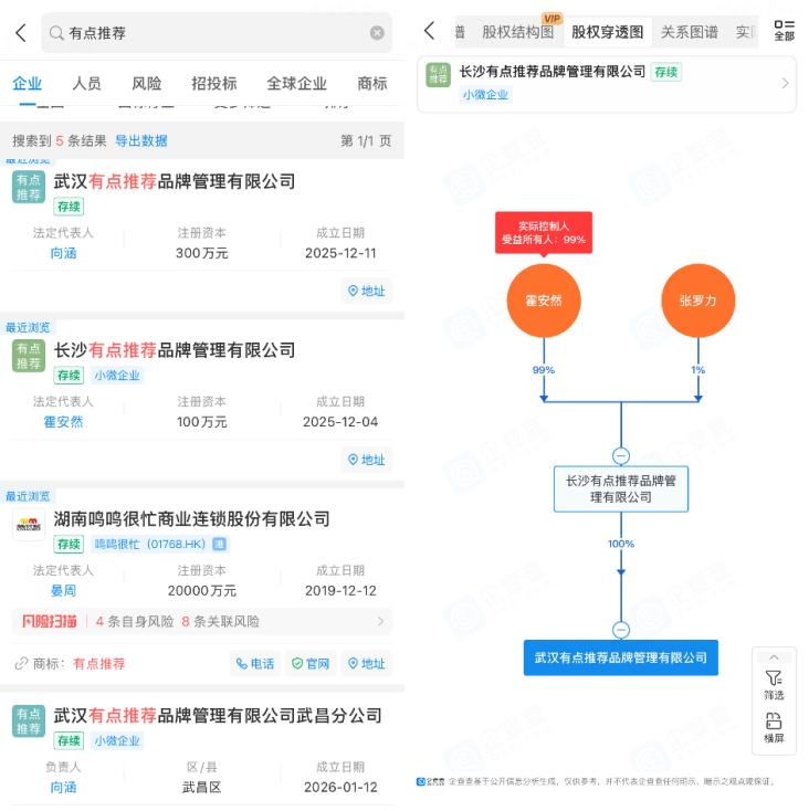 随后,壹览商业在企查查发现,有点推荐的主体公司为武汉有点推荐品牌管理有限公司,该公司由长沙有点推荐品牌管理有限公司全资持股。而长沙有点推荐品牌管理有限公司的实际控制人为霍安然,持股99%,张罗力持股1%。从明面上看,有点推荐与鸣鸣很忙确实并不存在股权联系。
