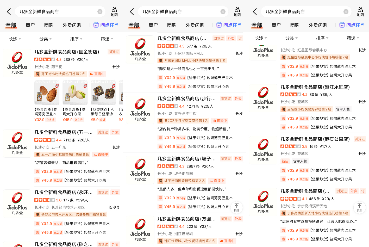 具体到门店运营层面,主要聚焦在SKU数量和选址布局上。新鲜零食店聚焦核心品类,SKU在300~1200区间;传统量贩零食店的SKU有1000~3000个。与量贩零食多开在大型社区周边、学校门口、县城主街不同,新鲜零食店更多开在当地的购物中心。以几多全为例,大众点评显示,其在长沙的20家门店,均分布在五一广场、吾悦广场、万家丽国际MALL等核心商业综合体,购物中心覆盖率达100%。