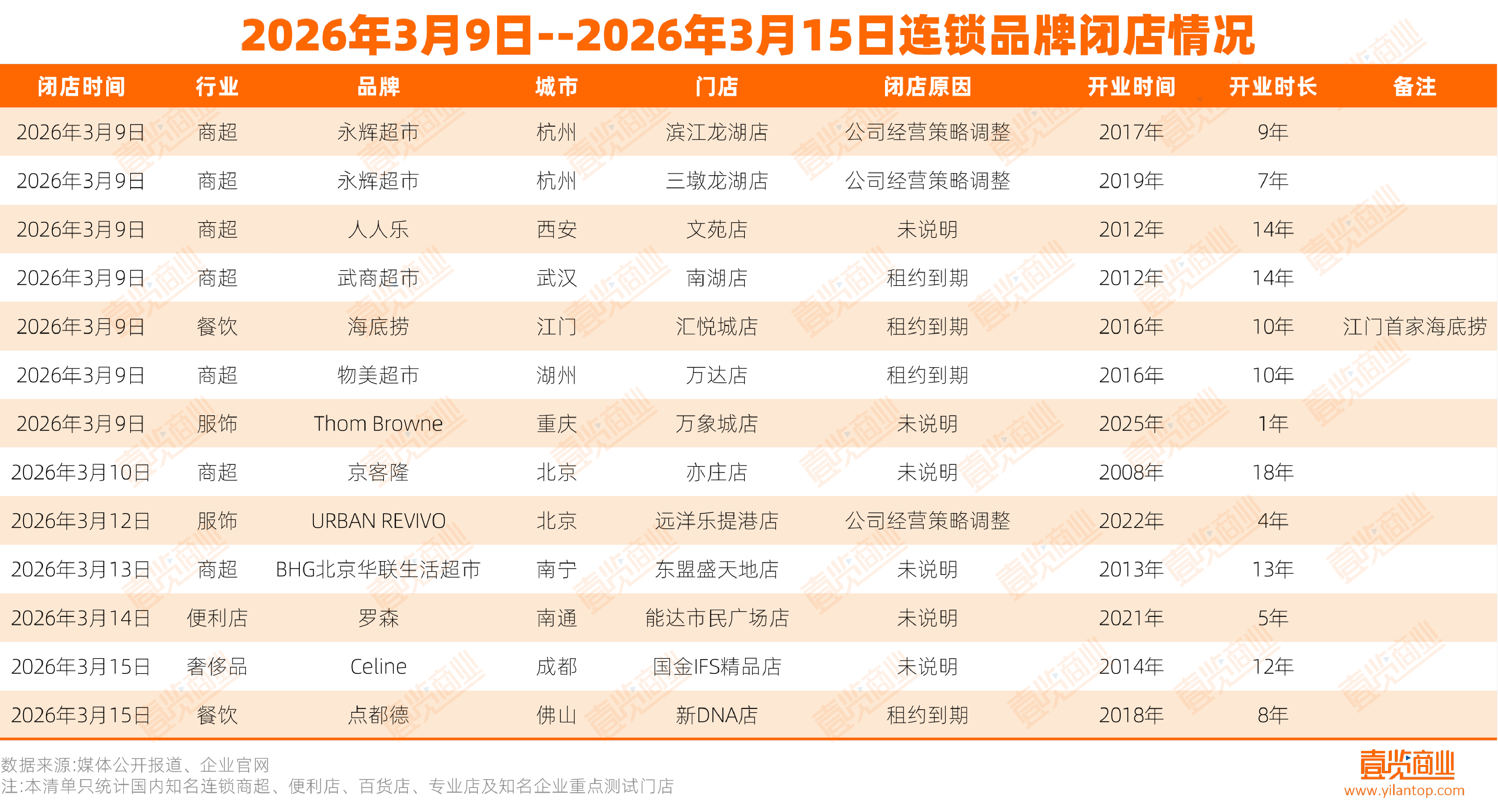 据壹览商业不完全统计,2026年3月9日——2026年3月15日,国内知名连锁超市、便利店、百货店、专业店及知名企业重点测试门店,共有12个连锁品牌关闭了至少13家门店。