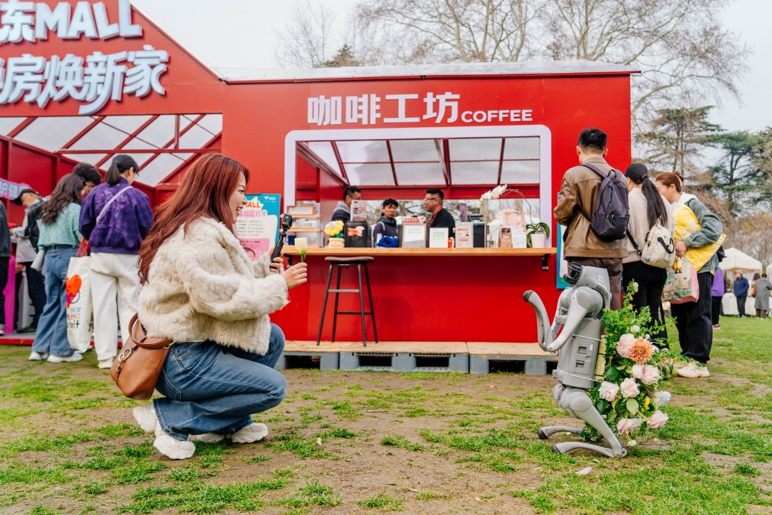 现场最吸睛的,莫过于“明星嘉宾”——宇树科技的机器狗,在京东MALL快闪店前主动与市民互动,时而挥手打招呼,时而做出卖萌动作,引得大人小孩纷纷驻足围观、拍照打卡,欢声笑语传遍樱洲。不少市民表示,“既能赏樱花,又能和机器人互动,这样的春日市集太有新意了”。