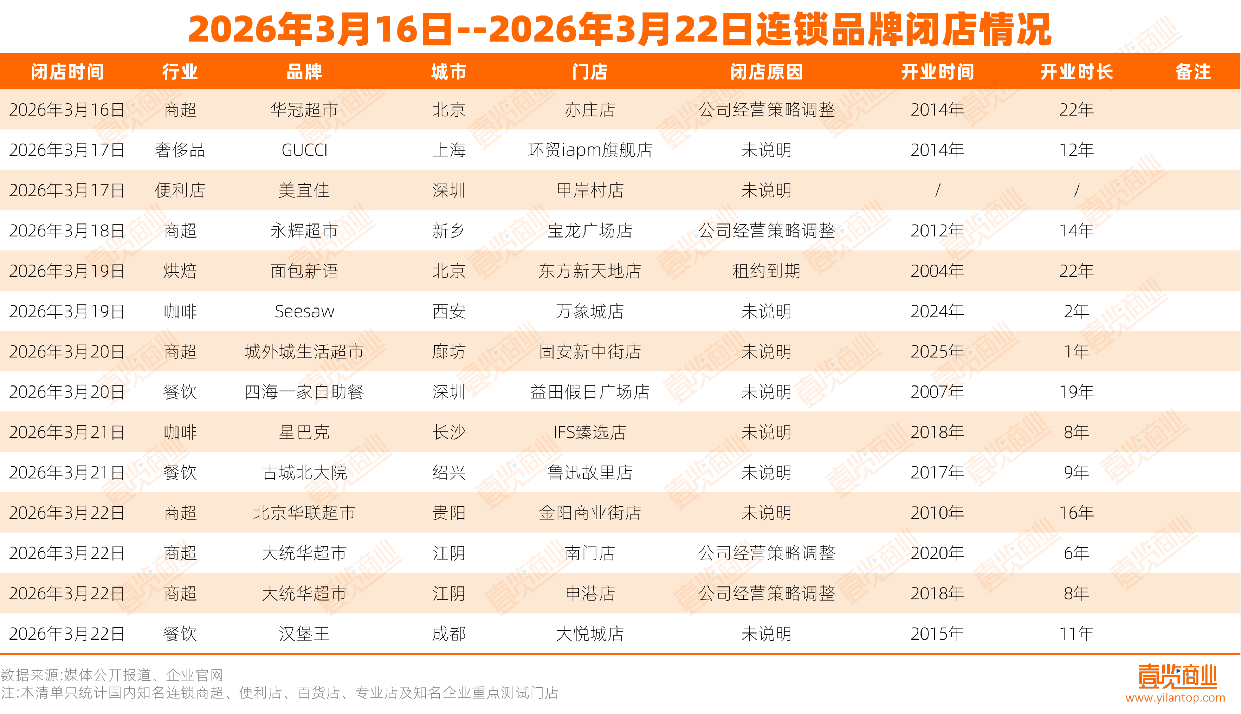 据壹览商业不完全统计,2026年3月16日——2026年3月22日,国内知名连锁超市、便利店、百货店、专业店及知名企业重点测试门店,共有13个连锁品牌关闭了至少14家门店。