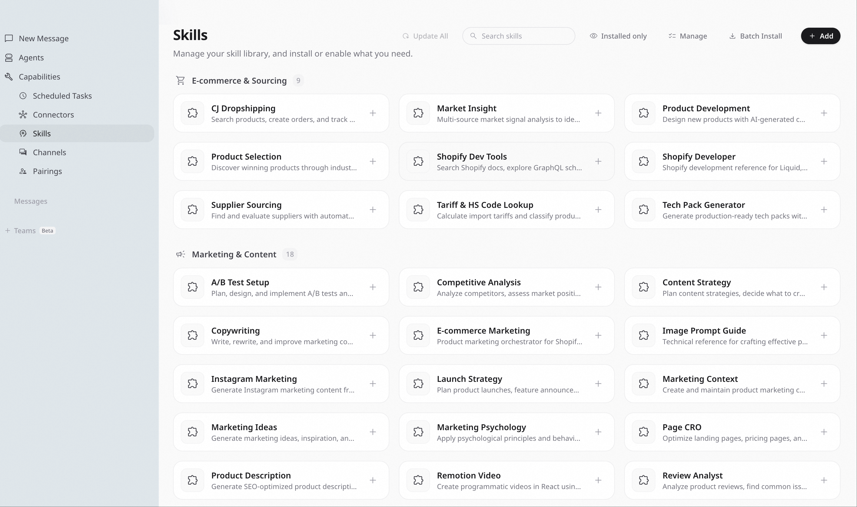 为此,Accio Work特别定制了“电商专家”“网店运营”“一件代发货”等多个专业Agent,并面向生意领域定制了大量专用“技能包”(skills),覆盖电商与供应链、营销与内容创作、研究与洞察、金融与财务等多个领域。