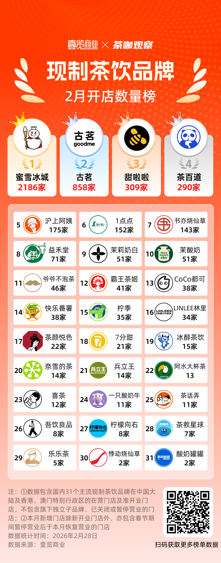与同行对比,茶颜悦色的扩张节奏更显克制。据壹览商业统计,2026年2月,31个主流现制茶饮品牌中,茶颜悦色2月新增的门店数量排在第17,2月新增门店数量超过100家的有7个品牌,新增门店超过30家的有16个品牌。