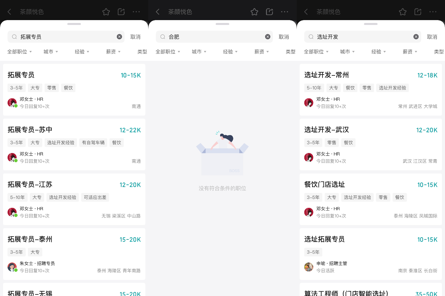 据报道,“选址开发”“拓展专员”等职位是由湖南茶悦文化产业发展集团有限公司在合肥发布的岗位信息。茶咖观察于3月26日在Boss直聘上进行检索,发现相关岗位已关闭。
