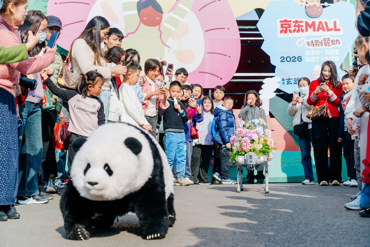 作为本次活动的特别赞助商,京东MALL以“不换房焕新家”为主题,在樱洲打造沉浸式AI智能生活快闪店,搭建可感、可触、可互动的未来家体验空间。让市民在赏花赏景之余,零距离感受智能家居带来的松弛生活。京东MALL还联动京东智能机器人业务部门,带来央视春晚舞台上惊艳全国的魔法原子机器熊猫。作为京东MALL快闪店的重磅“明星”,它在玄武门一亮相便吸引了游客围观,成为当之无愧的流量担当。圆滚滚的熊猫造型憨态可掬,时而跳舞卖萌,时而站立打招呼,引得大人小孩纷纷驻足围观,拍照合影。