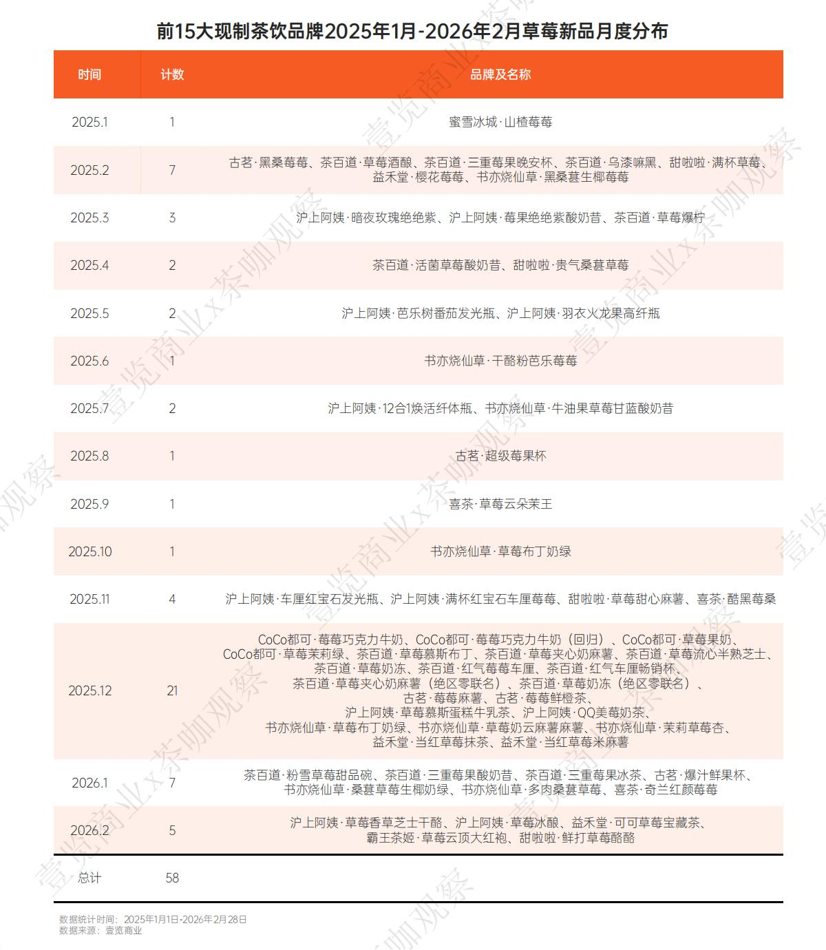 壹览商业统计,2025年2月至2026年2月,主流现制茶饮品牌共推出58款含草莓元素的新品,草莓成为仅次于柠檬的头部水果小料。