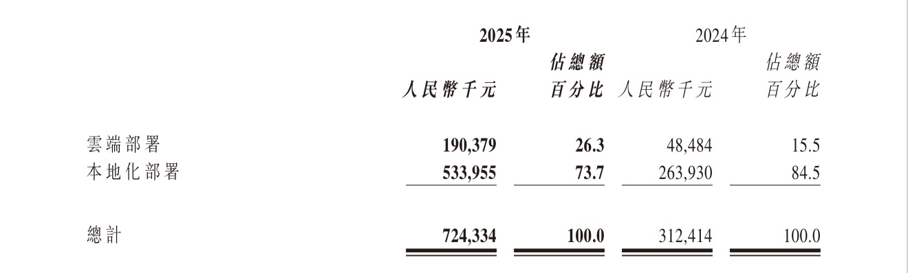 其一是本地化部署业务。2025年,该业务实现收入5.34亿元,同比增长102.3%,占总收入的73.7%。这一业务主要面向政府及大型企业客户,提供私有化部署的大模型解决方案。由于涉及数据安全与定制化需求,客单价较高、客户粘性较强,也因此成为公司现阶段最稳定的收入来源。