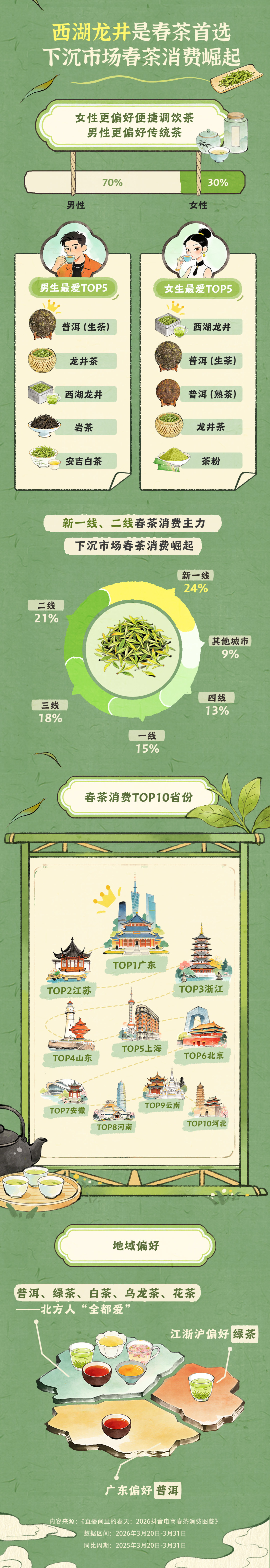 城市分布方面,新一线与二线城市是春茶消费主力,合计占比达45%。同时下沉市场春茶消费崛起,三线及以下城市合计占比达40%。春茶消费前十省份依次为:广东、江苏、浙江、山东、上海、北京、安徽、河南、云南、河北。地域偏好鲜明,广东偏爱普洱,江浙沪偏爱绿茶;而北方消费者对普洱、绿茶、白茶、乌龙茶、花茶等多品类“全都爱”。