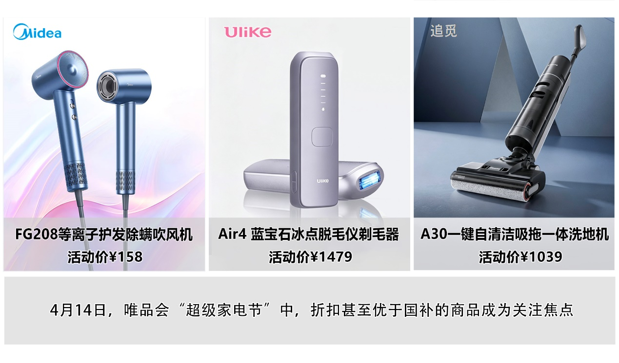 甚至并不以家电而知名的平台,如今也因为高性价比,而收获更多关注——据特卖电商唯品会相关负责人介绍,其4月14日早10点开启的超级家电节中,美的低至158元的等离子高速吹风机、追觅低至1039元的A30洗地机等,折扣价甚至比此前国补价更低,成为活动中关注度最高的爆款商品。
