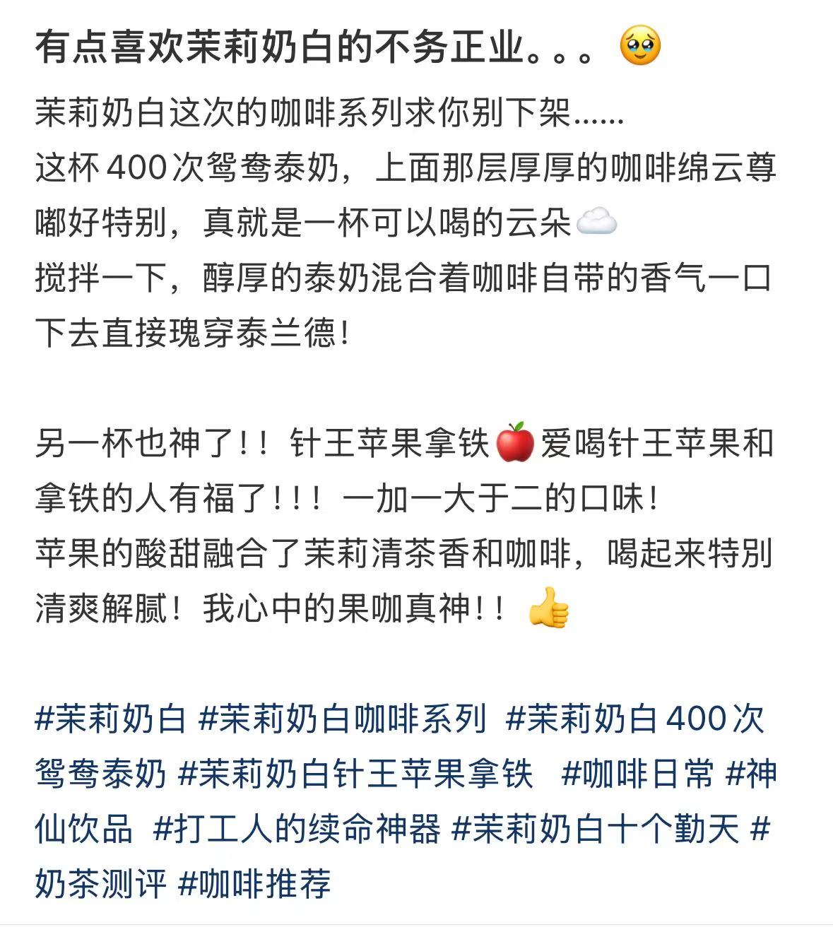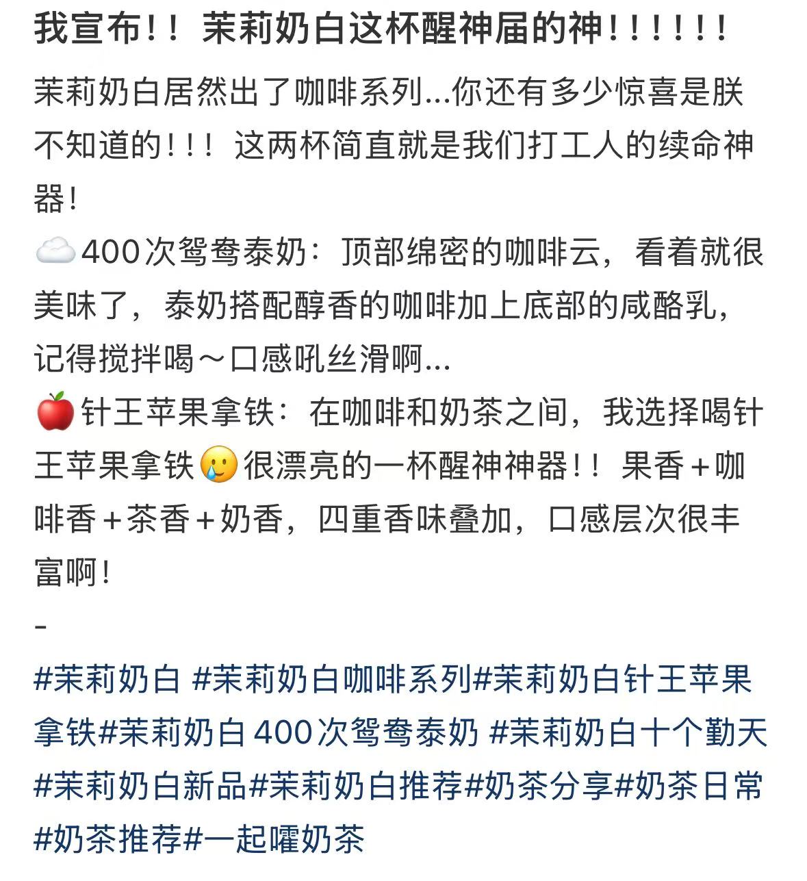 今天,茉莉奶白官宣,自4月16日10:00起,全国上新特调咖啡系列饮品,标志其正式布局咖啡品类。