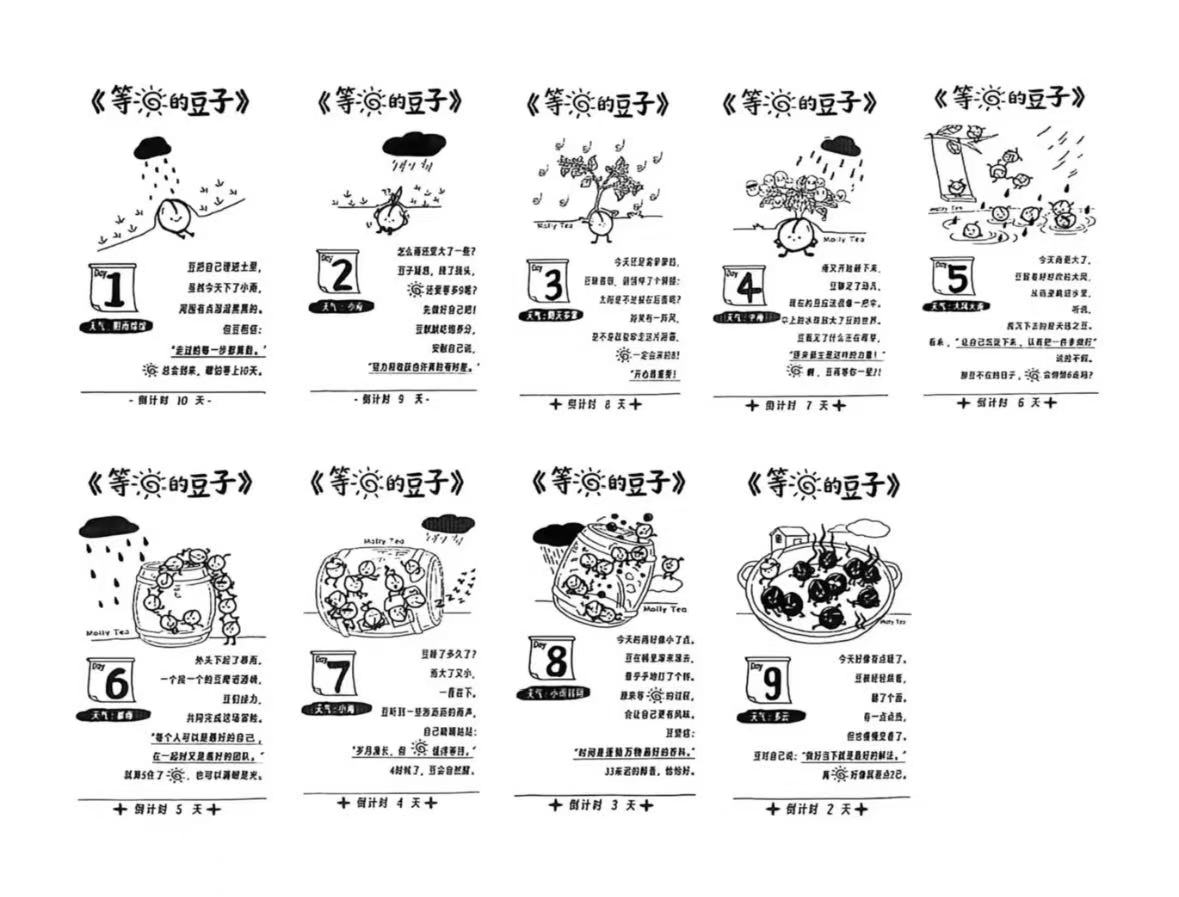 早在4月6日,即正式上新前十天,茉莉奶白就开启了小票预热活动。在顾客随单附赠的小票上连载原创漫画《等太阳的豆子》。该漫画以组合“十个勤天”故事为原型,讲述了十颗豆子在十天里经历风雨,等待天晴的故事。