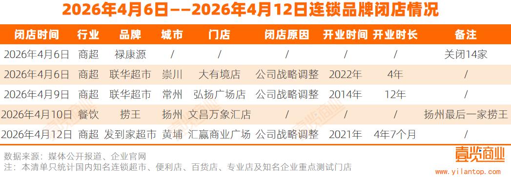 据壹览商业不完全统计,2026年4月6日——2026年4月12日,国内知名连锁超市、便利店、百货店、专业店及知名企业重点测试门店,共有4个连锁品牌关闭了至少18家门店。