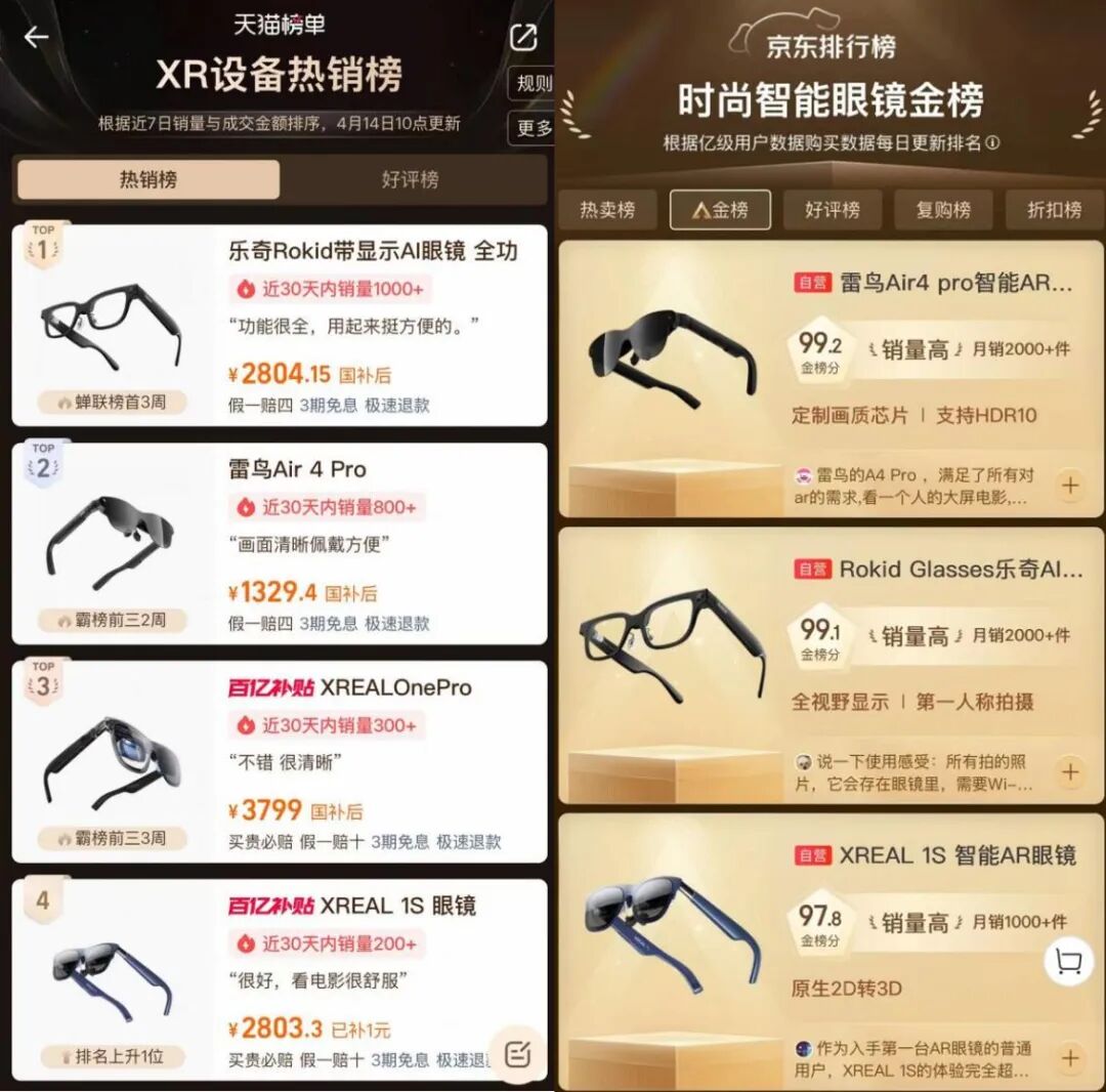 Rokid的需求量在国内主流电商平台中也可以直观看出,京东“时尚智能眼镜金榜”显示,Rokid与雷鸟的AR眼镜月销量均在2000+,XREAL为1000+;而在天猫“XR设备热销榜”上,Rokid位列榜首,近30天销量超1000件,其他品牌均未过千。