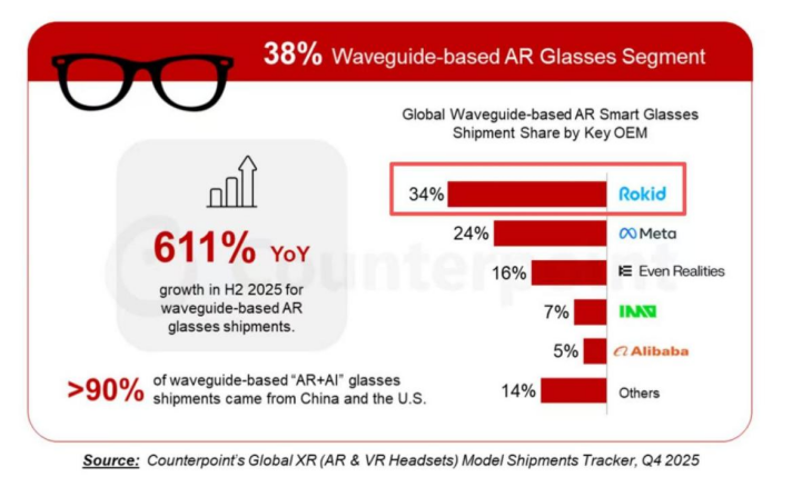 据余杭市政府援引全球技术市场研究咨询机构Omdia数据显示,Rokid在AI眼镜全品类中位居全球第二、中国第一,带显示功能细分赛道更是位居全球榜首。另据Counterpoint Research报告,2025年下半年,Rokid在光波导信息提示类AR眼镜细分市场以34%的份额位居全球第一,领先于Meta(24%)和Even Realities(16%)。