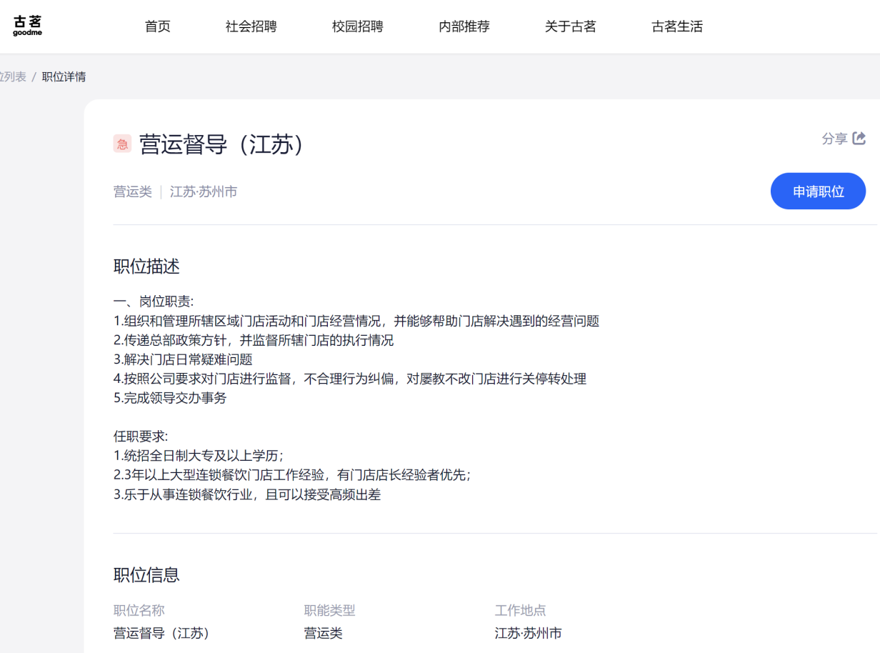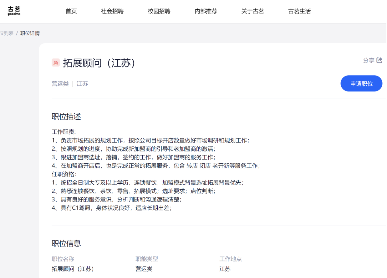 另外,茶咖观察还发现,古茗官网显示于近日上架了新的岗位,定位江苏。发布的岗位为拓展顾问、营运督导。古茗官网招聘一般都会写明具体工作城市,只有新岗位显示是江苏。