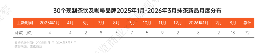 壹览商业统计,2025年1月至2026年3月,30个主流现制茶咖品牌共推出72款含抹茶元素的新品,从月度分布看,2026年3月单月上新18款,创下历史峰值。春秋两季构成两大推新高峰,显示出抹茶与季节更替、消费场景的强绑定关系。