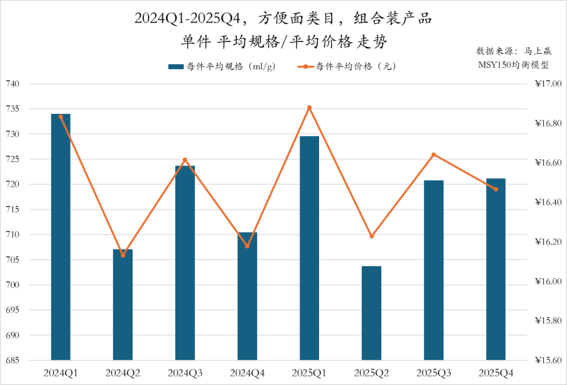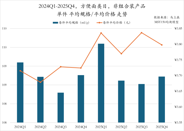 二是单件产品涨价。马上赢数据显示,2025年各季度,方便面类目非组合装产品的单件平均价格均高于2024年同期,且价格上升幅度显著高于规格上升幅度。组合装产品除第四季度外,各季度每件平均规格较2024年同期稍有缩减,而单件平均价格反而有所提升,这也反映出企业通过“减量”与“涨价”的组合推动价格上行。