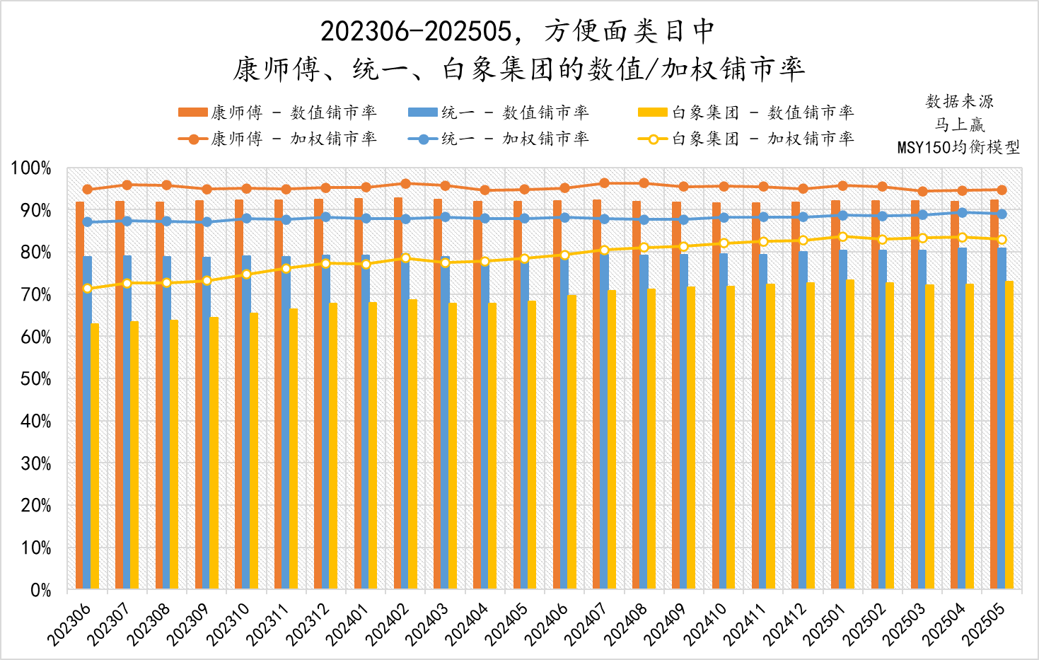 第一个维度是数值铺市率,反映渠道覆盖的“广度”,即有多少家店在卖这个品牌。马上赢数据显示,2023年6月至2025年5月的两年间,康师傅数值铺市率始终稳定在92%以上,这意味着全国几乎每一家有方便面货架的零售门店,都能看到康师傅的产品;统一在80%以上,同样是全国性的高覆盖水平。而白象虽然近年来铺市进度明显加快,但数值铺市率仍处于70%至75%之间。