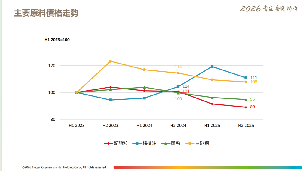 成本端的同步改善进一步放大了提价效果。康师傅在财报中透露了主要原材料价格走势,棕榈油、面粉等原材料的价格相较于2024年有不同程度的下滑。