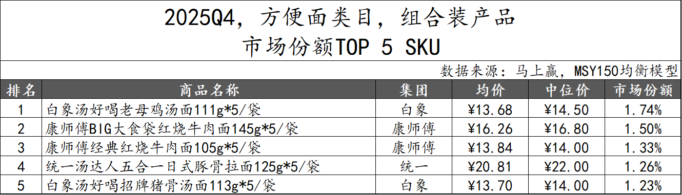 真正支撑市场基本盘的,依然是各品牌经营多年的核心单品。马上赢数据显示,方便面类目非组合装产品市场份额TOP 5 SKU中,统一凭借汤达人、茄皇和来一桶三个经典系列占据3席,康师傅以红烧牛肉面的不同规格占据2席;组合装产品TOP 5 SKU同样由白象汤好喝、康师傅红烧牛肉面、统一汤达人等经典产品包揽。
