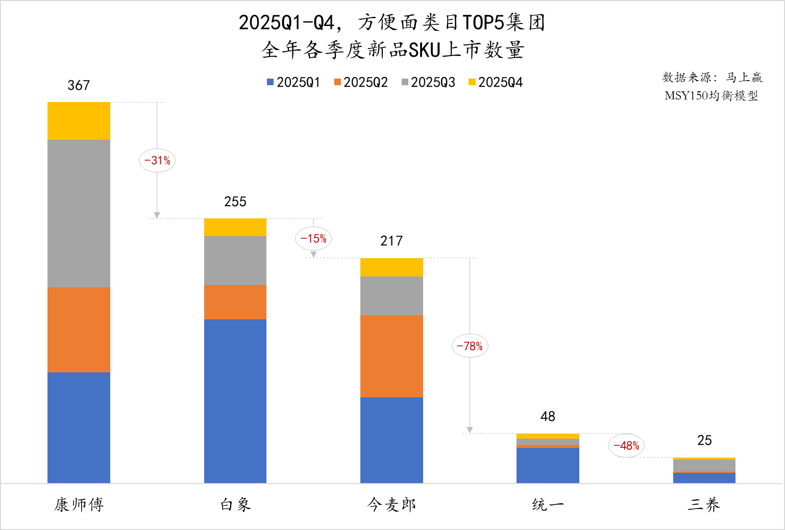 从新品推出数量看,根据马上赢数据,康师傅全年上市新品SKU达367款;白象和今麦郎紧随其后,分别为255款和217款;统一全年仅推出48款新品,三养25款。