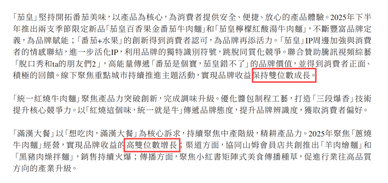 一是产品结构向高价格带迁移。康师傅2025年业绩公告显示,高价袋面销售占比达39%;统一在2025年财报中提到,食品业务增长的主要驱动力来自高端产品,其中,“茄皇”和“满汉大餐”两款高端产品的全年收益保持双位数增长。