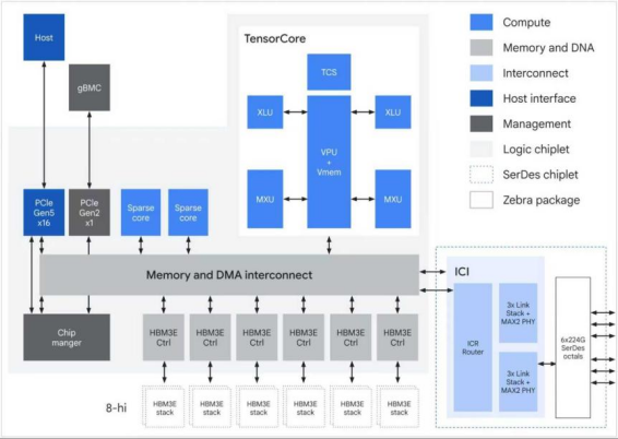 作为目前的旗舰产品,第七代TPU Ironwood在核心参数上已实现直接对标英伟达Blackwell B200。Ironwood单芯片可提供4.6 PetaFLOPS的FP8峰值算力,配备192GB HBM3e内存。单个Superpod通过集成9,216颗芯片,可提供42.5 ExaFLOPS的总算力。