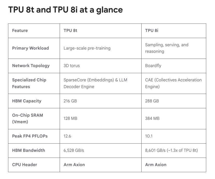 在Ironwood全面商用的同时,谷歌首次打破了TPU系列单一架构的传统,针对训练与推理两个不同的经济模型,推出了第八代TPU的两种特化版本:针对训练优化的TPU 8t 以及针对推理与Agentic AI优化的TPU 8i。