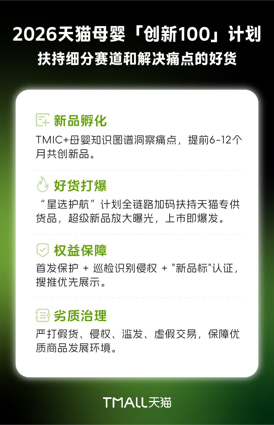 4月23日,记者从天猫金婴奖获悉,2026年天猫母婴行业将推出“创新100”计划:投入确定性资源,扶持细分趋势赛道和能解决真痛点的品质好货,帮品牌找到新增长。