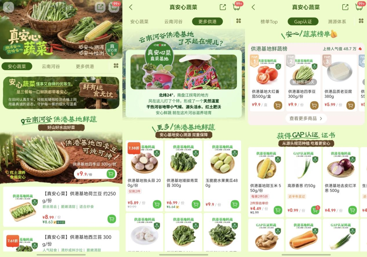 4月23日,叮咚买菜宣布正式推出“真安心菜”项目,app同步上线“真安心菜”专区,整合GAP(良好农业规范)与供港基地两套高标准体系,针对韭菜、豇豆、菠菜、生姜等用户关注度较高的重点管理蔬菜,构建从源头土壤到终端的全链路品控闭环,将高标准蔬菜以日常平价推向市场。用户打开APP,在商品详情页就能查看“真安心菜”蔬菜的认证标识、产地信息和对应批次的检测报告,让食品安全看得见、可追溯。