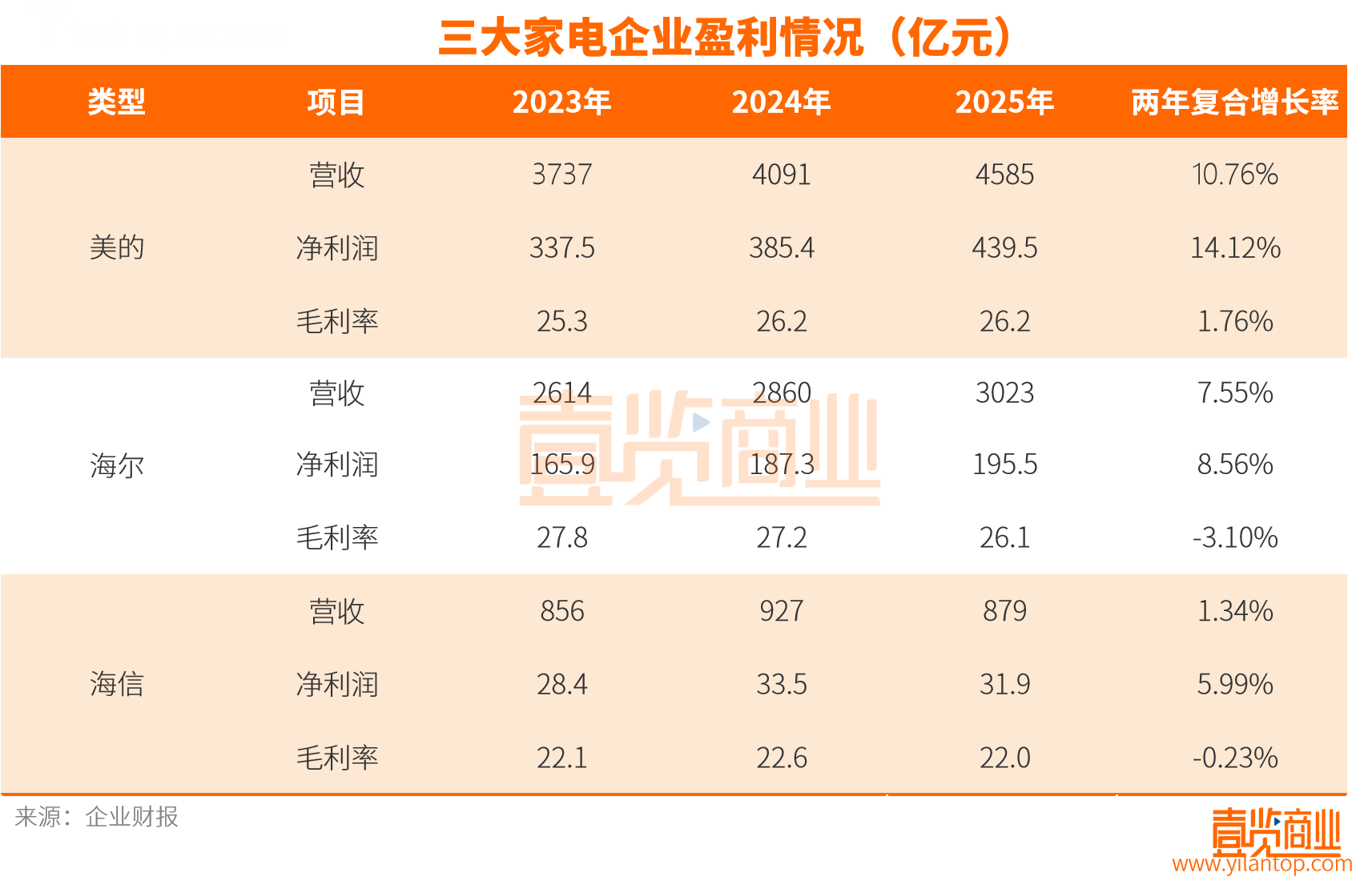 相比之下,海信家电的困境更为直观。2025年营收879亿元,同比下滑5.2%;净利润31.9亿元,同比下降4.8%。两年复合增长率仅为1.34%,几乎处于停滞状态。22%的毛利率在三家之中垫底,且波动明显,反映出品牌溢价能力的不足。从规模上看,美的营收是海信的5.2倍,海尔是海信的3.4倍,差距正在进一步拉大。