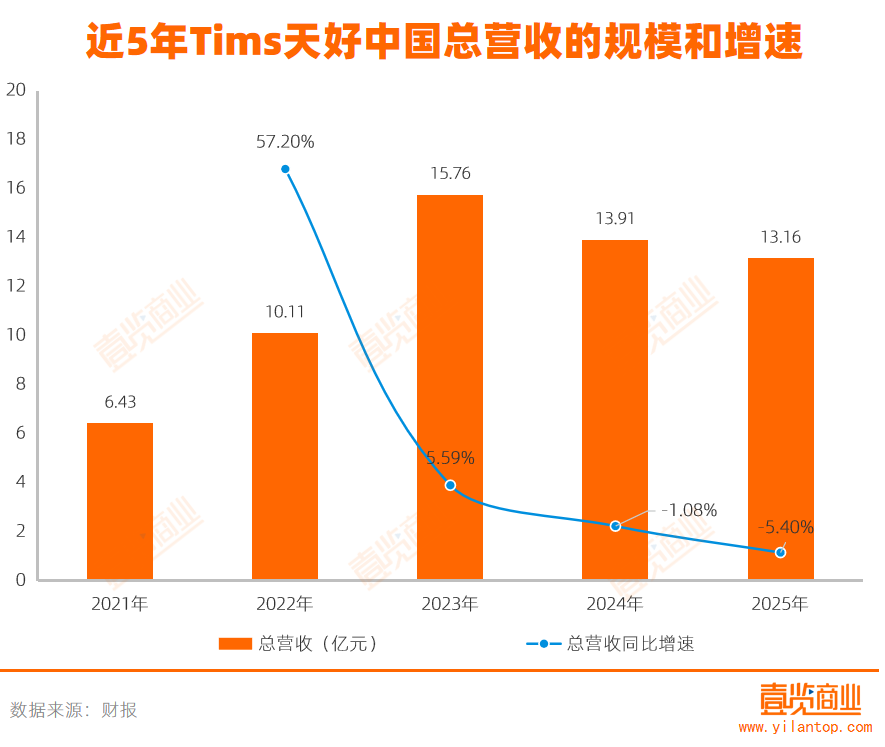 从营收看,Tims天好中国2022年和2023年总营收高速增长,增速达55%以上,营收在2023年达到最高,为15.76亿元;但2024年情况急转直下,营收同比下滑10.80%,降至13.91亿元;2025年进一步回落至13.16亿元,同比降幅收窄至5.40%,下滑态势虽有所放缓,但收入萎缩的趋势并未逆转。