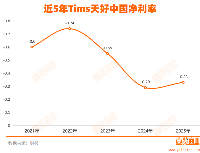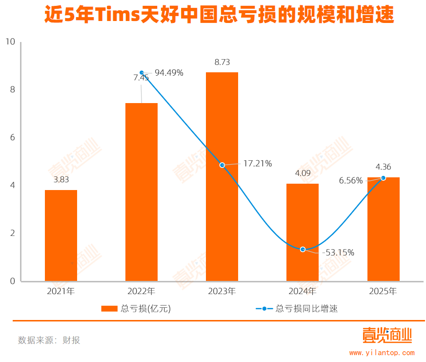 从净利润看,Tims天好中国进入中国至今,连续7年未能实现盈利,累计亏损30.76亿元。2023年亏损达到峰值8.73亿元;2024年亏损虽有大幅收窄,降至4.09亿元;但2025年亏损再次扩大,达4.36亿元。