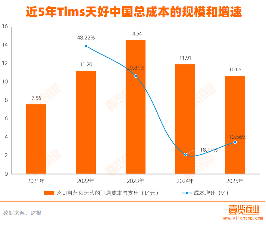 从成本与净利率看,Tims天好中国前期随门店快速扩张成本大幅攀升,后连续两年下降。2024年,Tims天好中国主动进行调整,开始“勒紧裤腰带”,当年公司自营和运营的门店成本与支出成本同比下降18.1%至11.91亿元;2025年进一步回落至10.65亿元。