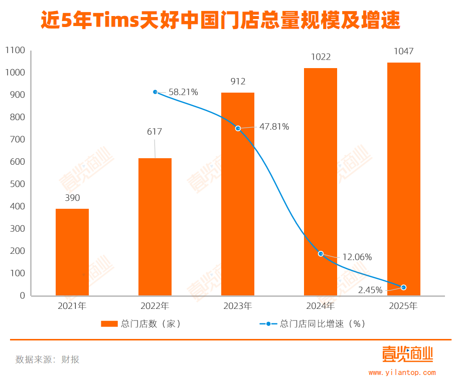 但到了2024年,增速开始放缓,降至12.1%;2025年增速进一步下滑至2.4%,全年净增25家门店,总门店数为1047家。
