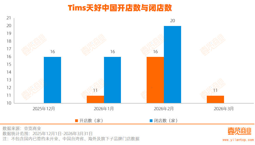 壹览商业数据显示,Tims天好中国2026年一季度新开38家门店,其中2月受春节影响,新开门店16家。