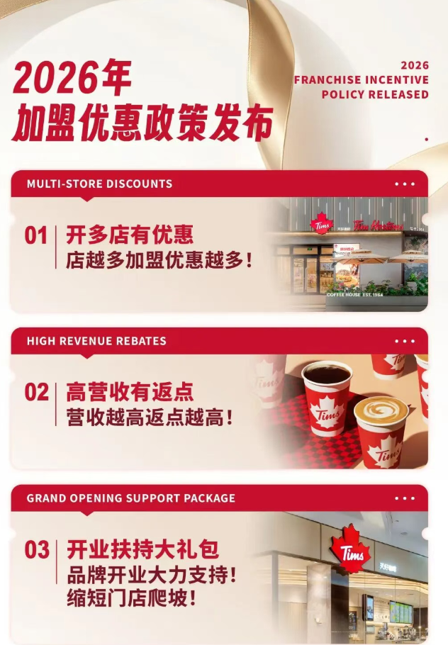 2023年9月,Tims天好中国仅在北京、上海两座一线城市开放单店加盟,所需启动资金约61万元;2024年,加盟范围扩展至全国,最低资金门槛降至56万元。到了2026年,公司进一步推出大堂店和独立店两种新店型,同时提供多店优惠、高营业额返点,以及包含全方位扶持的开业大礼包,意在进一步降低准入门槛。