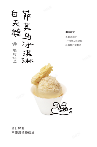 在广州,喜茶携手白天鹅宾馆,于沙面DP店限时推出「白天鹅·萨其马冰淇淋」。该产品以白天鹅宾馆标志性的榄仁萨其马为灵感,结合广西水牛乳制成冰淇淋,并加入榄仁与萨其马碎,形成多层次口感。这一合作依托双方在沙面区域的地理邻近关系展开,白天鹅宾馆作为广州本地具有代表性的酒店品牌,长期承载广府饮茶文化记忆,而喜茶则通过门店产品对传统风味进行再表达。