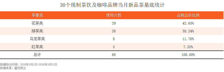 30个现制茶饮及咖啡品牌推出的132款新品中,茶基底使用次数总计68次。